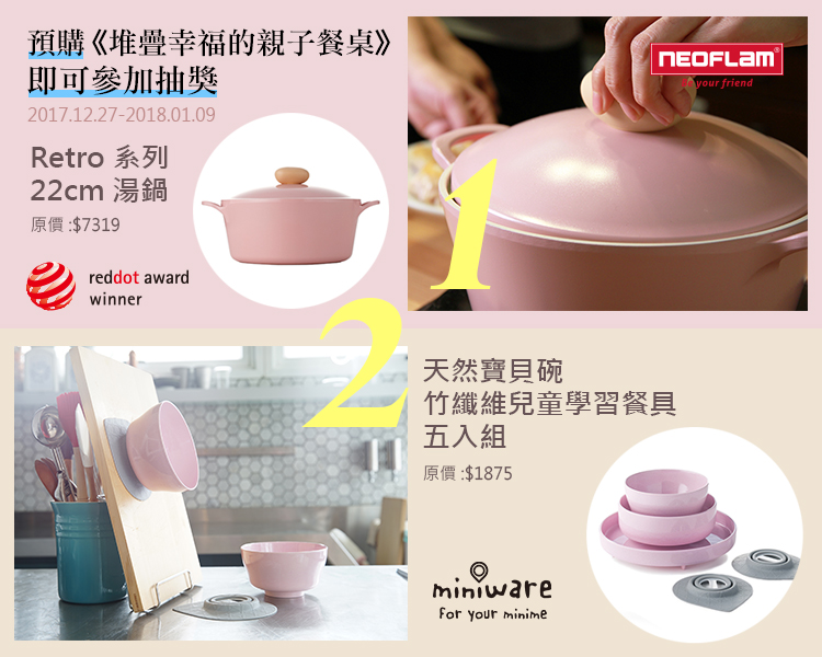 並於2018/1/12抽出兩名幸運得獎者,分別可獲得NEOFLAM Retro系列 22cm 湯鍋一只(原價$7319元)和MINIWARE天然寶貝碗-竹纖維兒童學習餐具五入組一份(原價$1875元)!